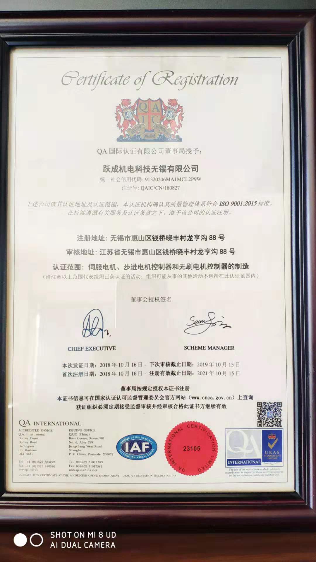 为进一步规范好色先生成人APP机电无锡有限公司(跃成机电科技无锡有限公司)业务流程、有效控制风险,形成标准化经营、规范化管理的模式,公司从战略的眼光出发,自2018年开展导入ISO9001质量管理体系。并顺利通过了中国质量认证中心认证和审核。