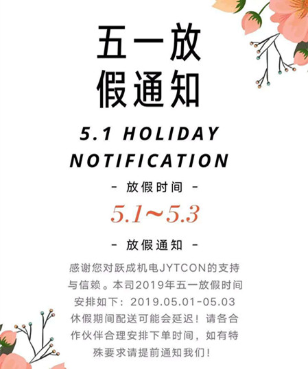 根据2019年国家法定假期的规定,并结合公司实际情况,好色先生成人APP(跃成机电)现对五一节放假做如下安排: